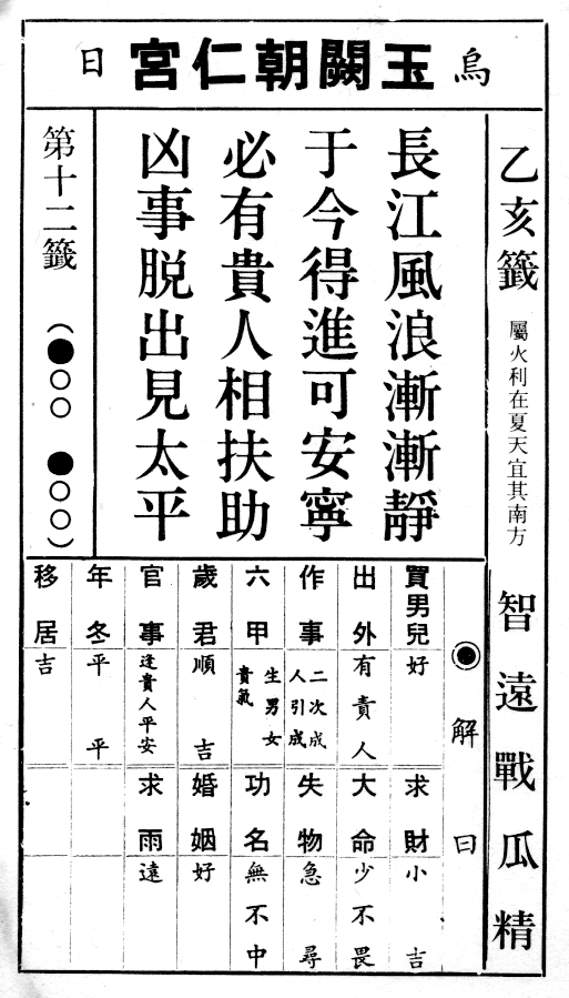 危險的事情終於在貴人的相助之下,可以轉為平安,就像長江的風浪平息了,船才得以安全的前進。求得此籤表示所期待的事面臨危險的狀況,必須忍耐並等待貴人相助才能夠解決,或找尋貴人幫忙化解危機。