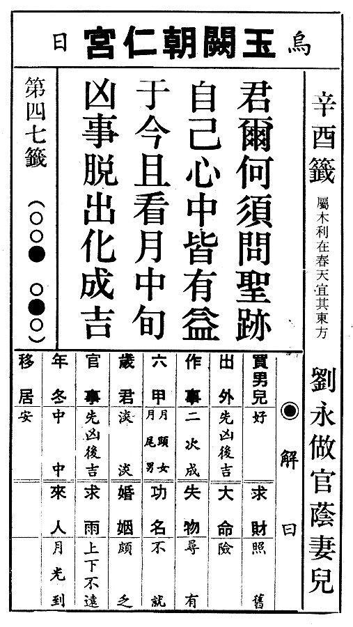 籤詩「自己心中皆有益」指點的事化解危險的方法。所祈求的事情,要自己想清楚選擇對自己有利的方向,這樣才可以讓自己趨吉避凶。