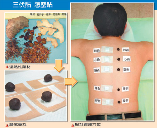 中醫講求冬病夏治,認為冬天好發的氣喘、鼻炎等過敏性疾病可在夏天做好預防措施,三伏天是一年當中最炎熱的三天,也是人體陽氣最盛時,選取適當藥材在特定穴位敷貼,北市聯合醫院中醫師楊麗姝比喻就像「讓皮膚吃藥膳」,藥物與炎熱天氣相輔相成,可驅散體內寒邪,增加抵抗力。
