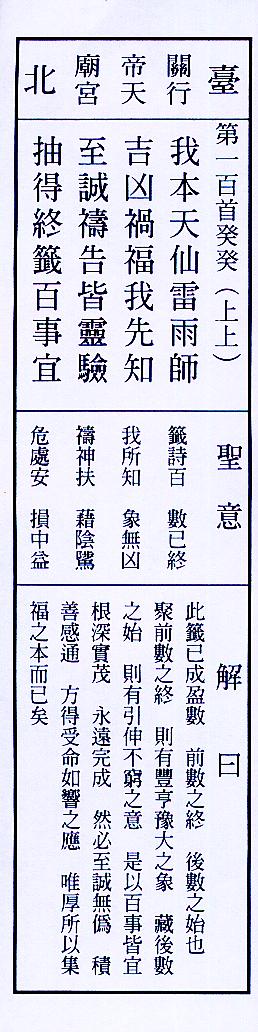 籤至一百。數之終也。休咎吉凶。莫逃聖意。
